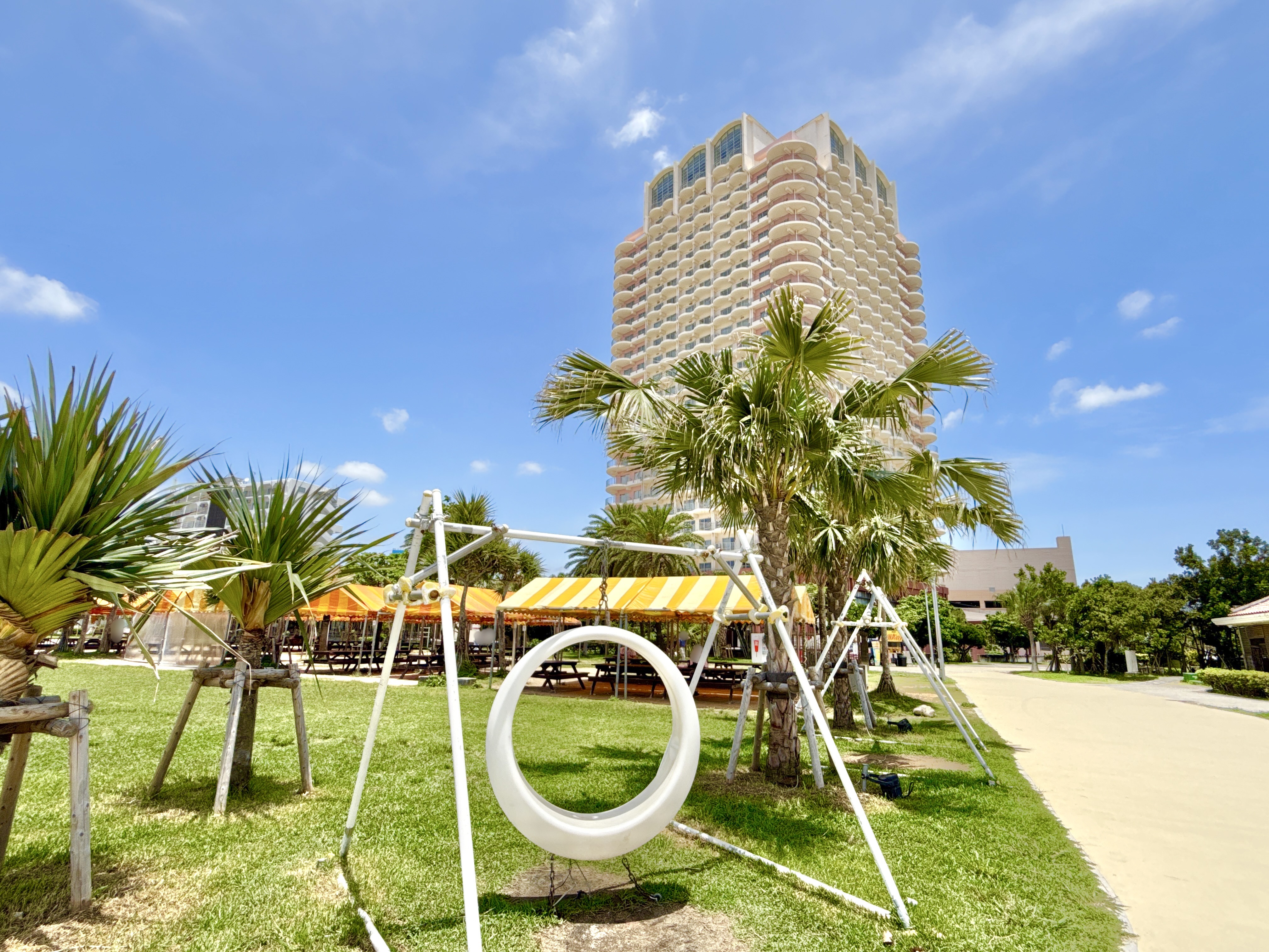 駐車場方面から、ホテル「ザ・ビーチタワー沖縄」の横を抜けてビーチに向かって歩いていると...