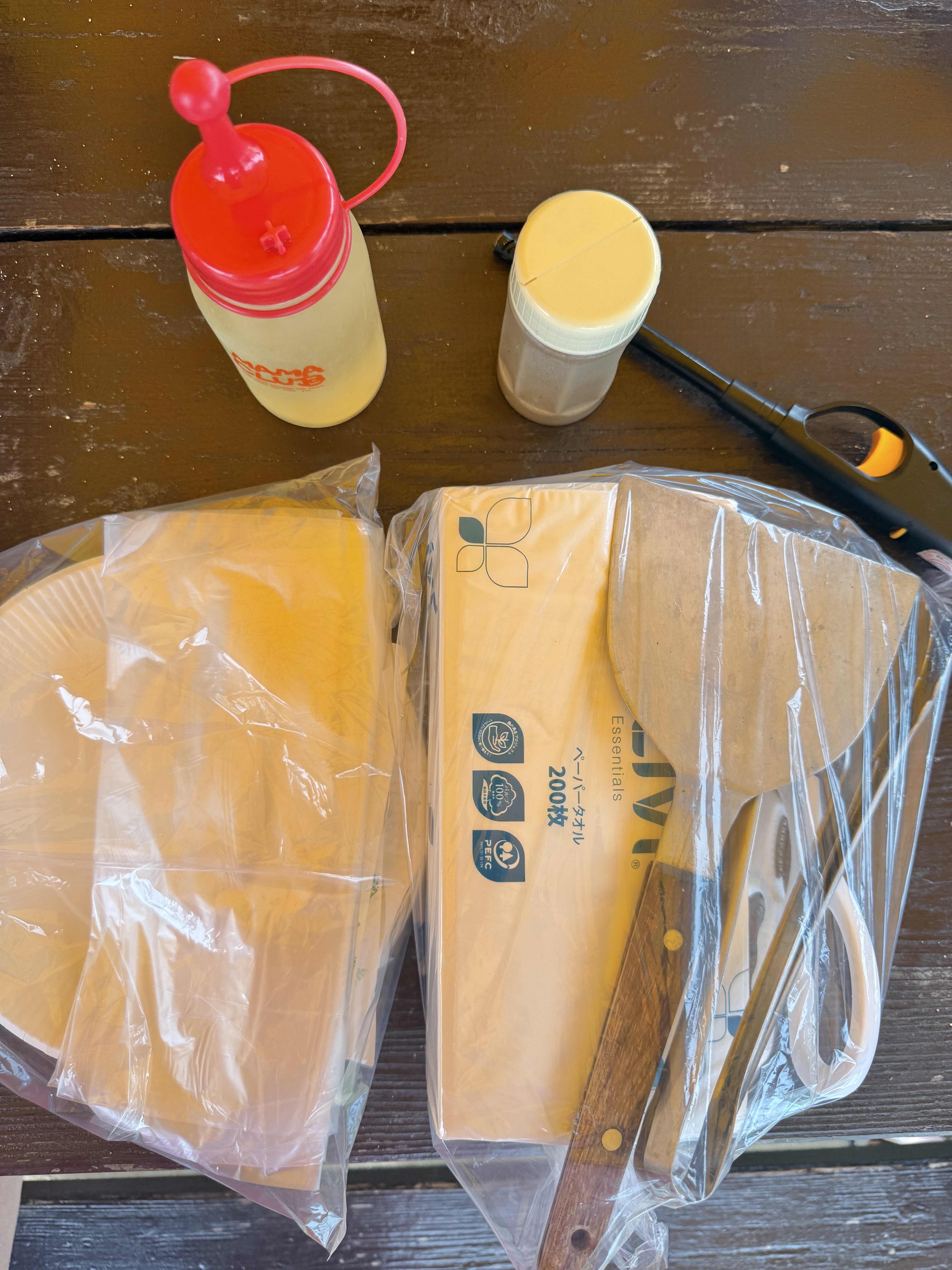 トング、ヘラ、チャッカマン、調理バサミ、キッチンペーパー、割り箸(予約人数分)、紙皿(予約人数分)、油、塩・コショウがついています。