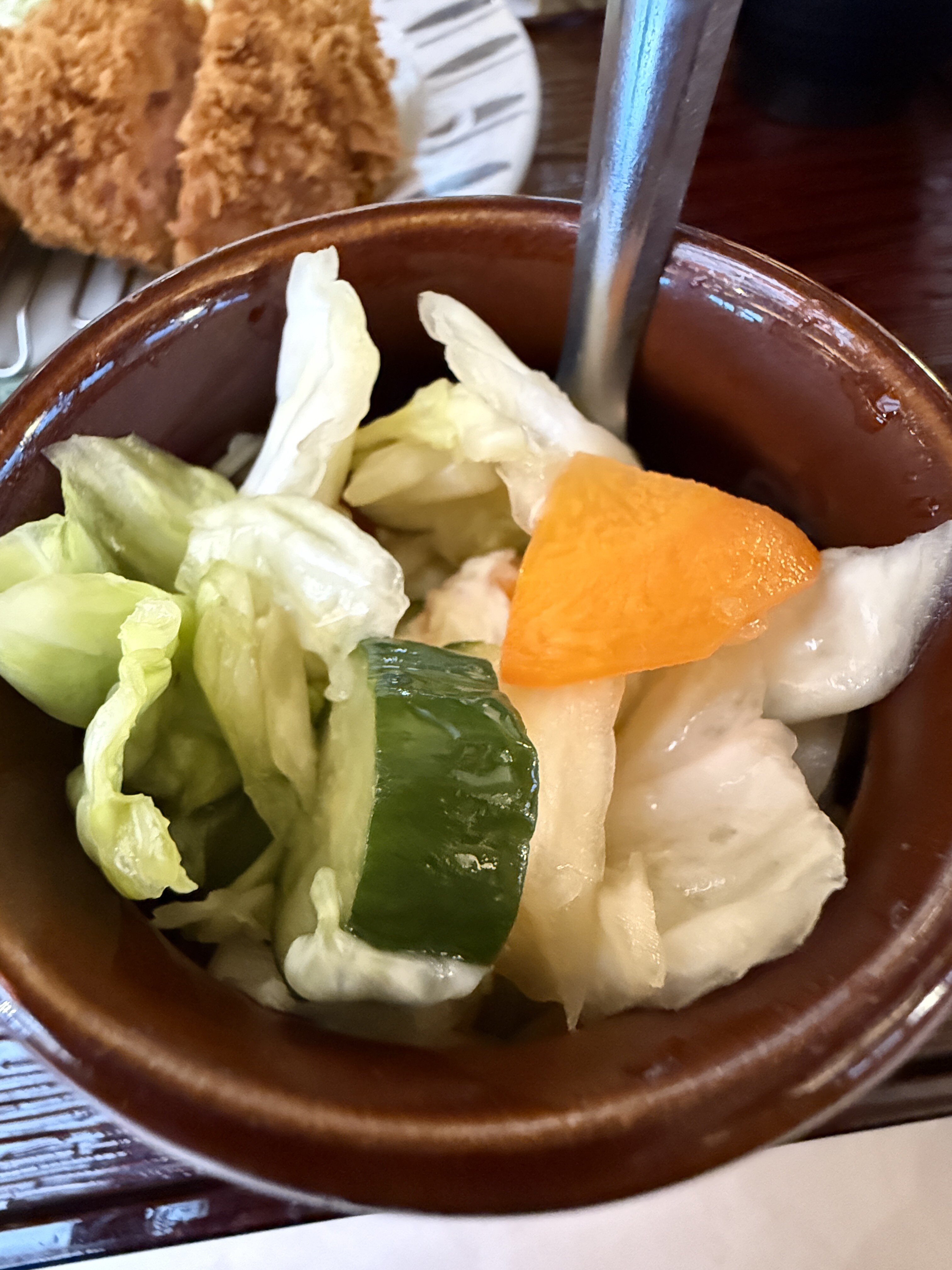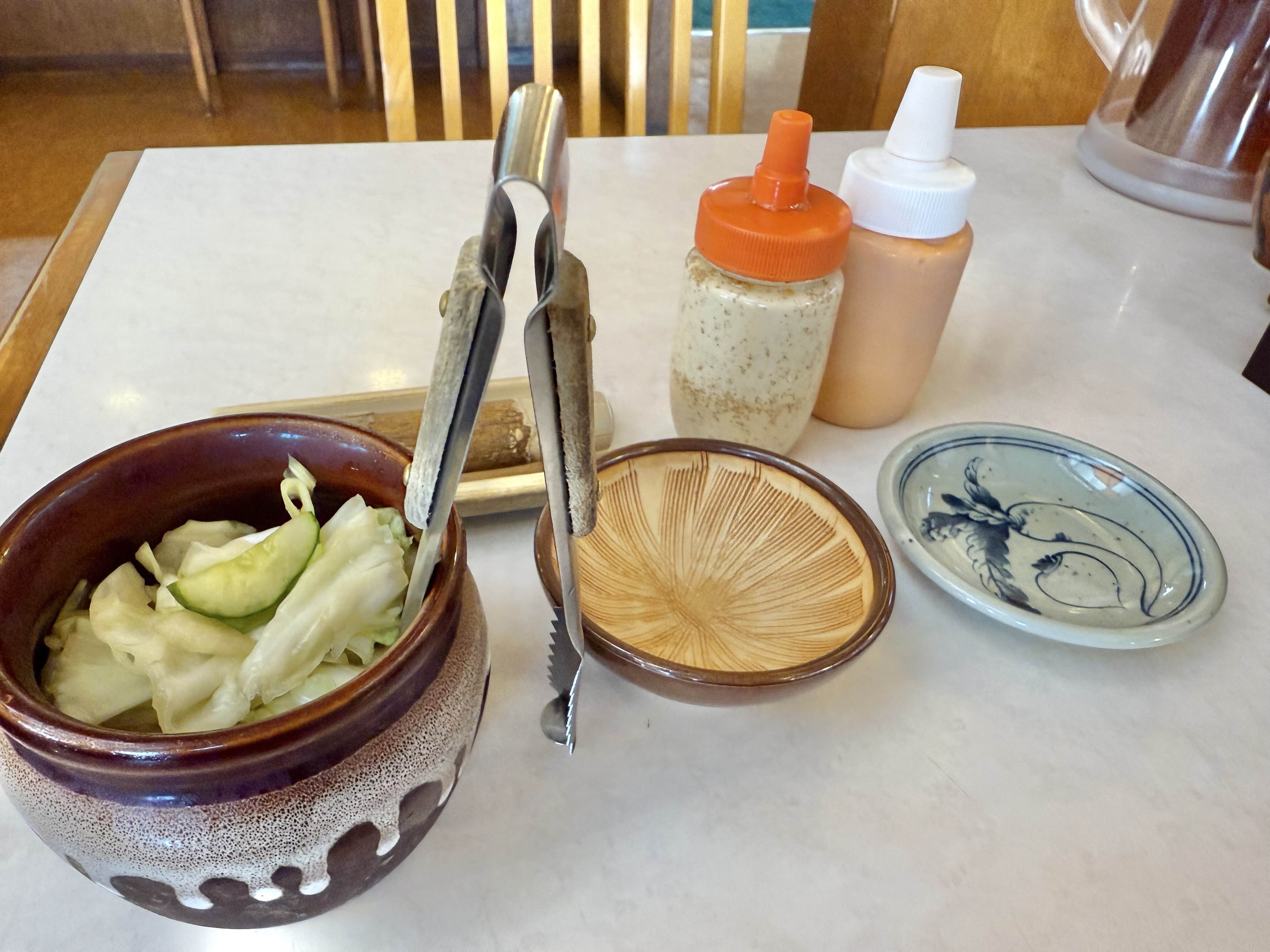 メンチかつを待っている間にお漬物を食べたら、めちゃくちゃ美味しくて手が止まらなくなり、気づいたら底が見えてきていました。