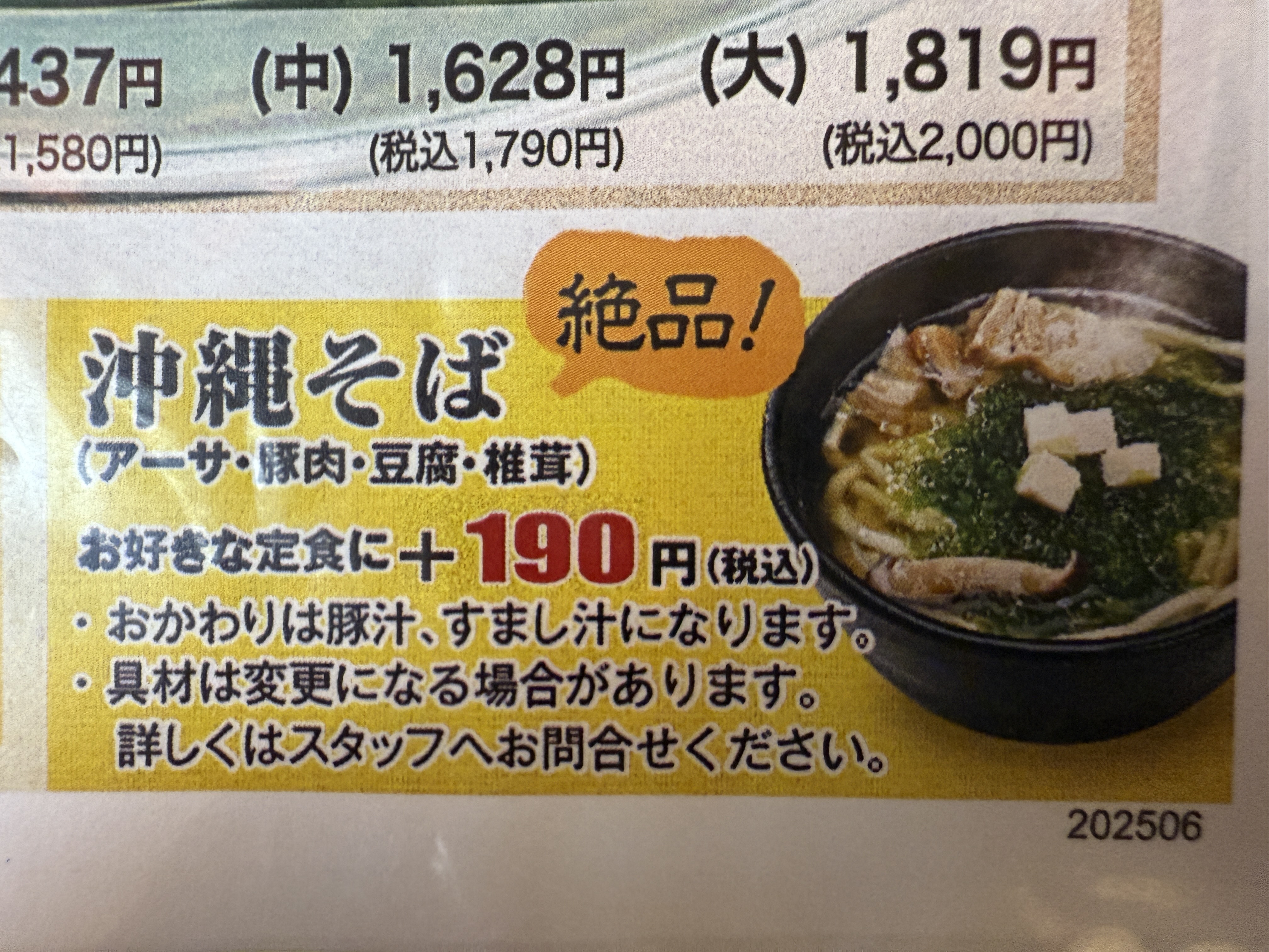 汁物は、プラス190円(税込)で、沖縄そばに変更もできます。