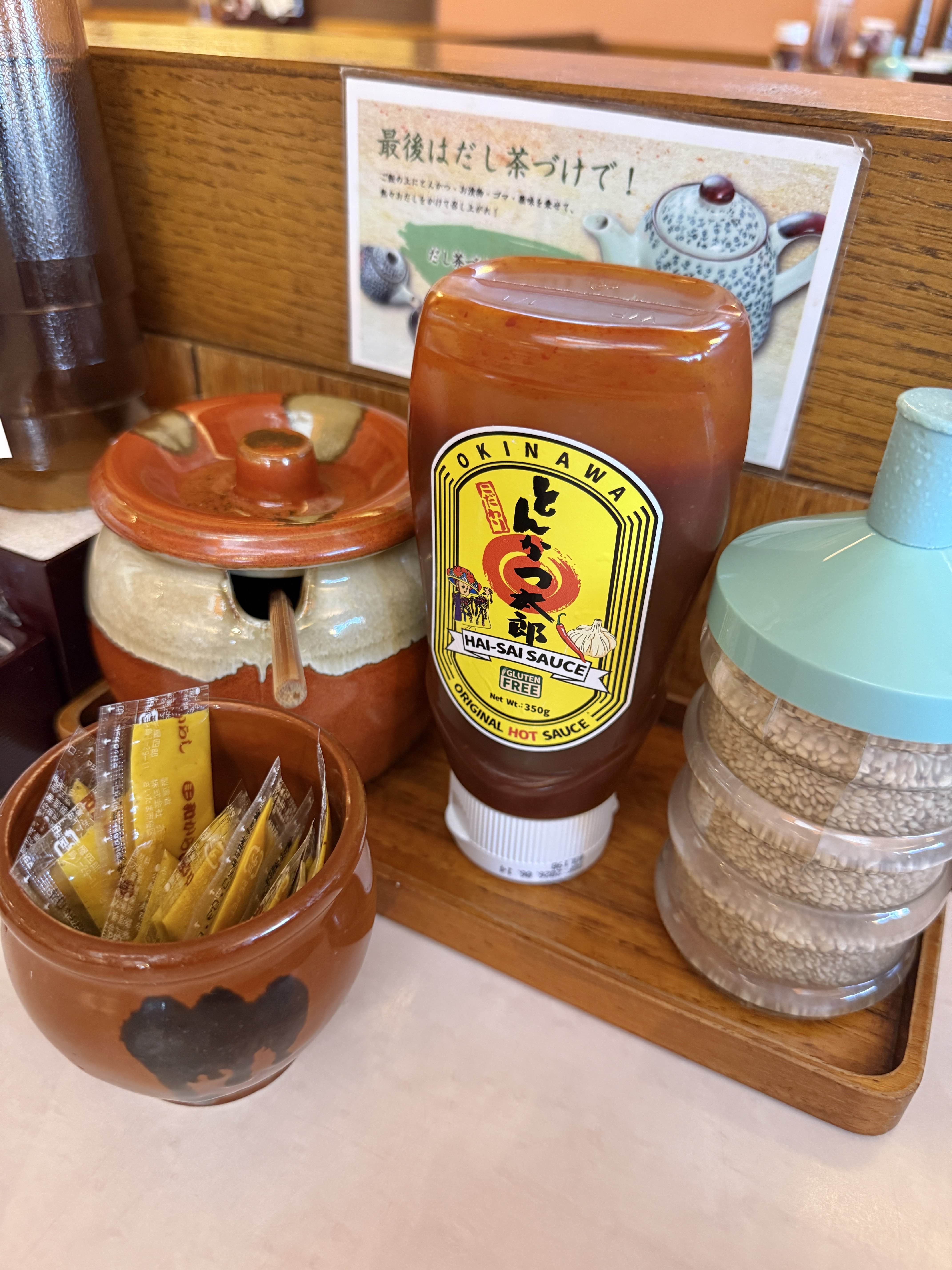 テーブルの上には、壺に入ったとんかつソースや沖縄生まれの旨辛調味料・ハイサイソースのとんかつ太郎オリジナルラベル版などが置かれています。
