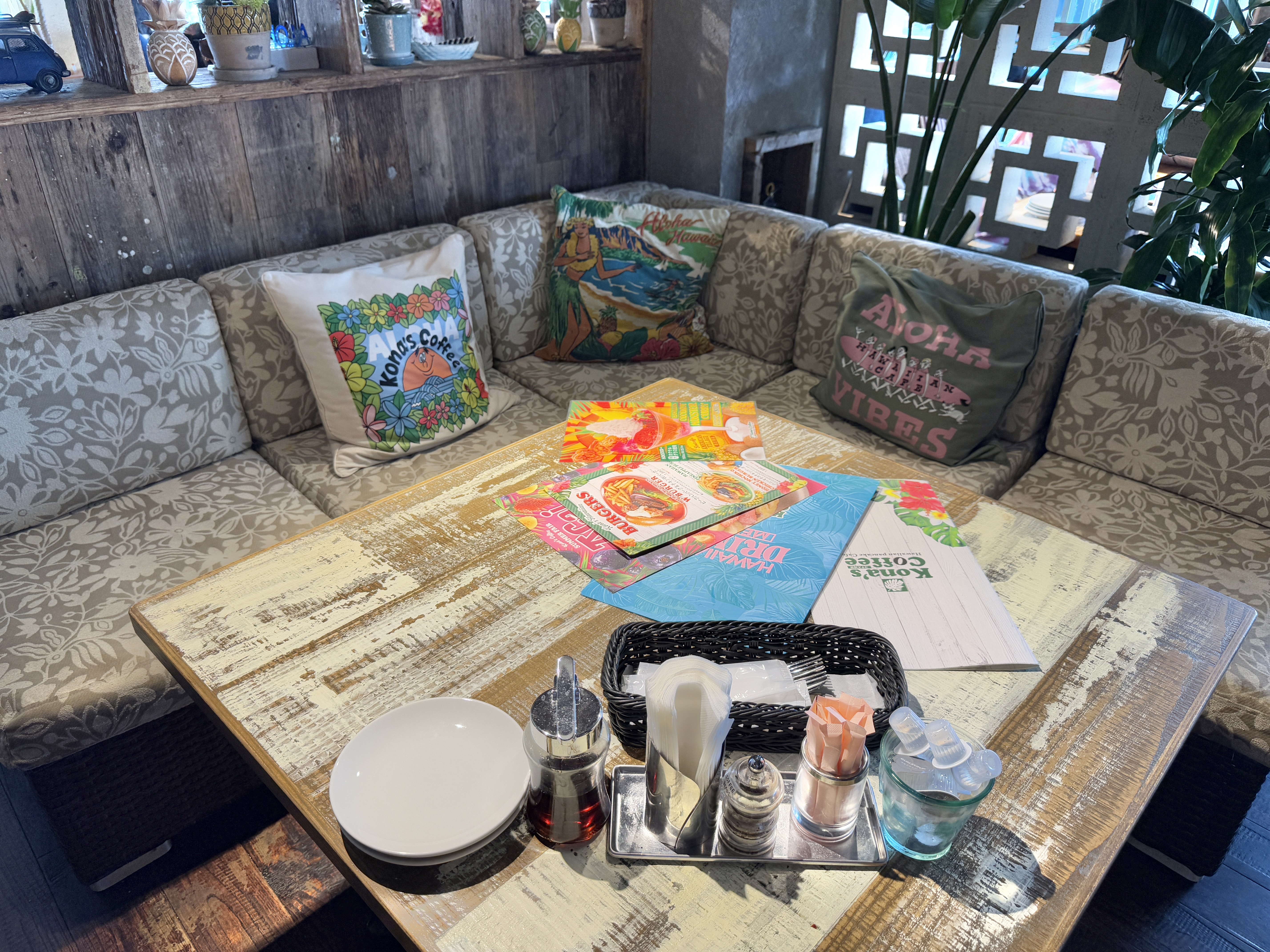 店内は、ハワイの雰囲気を感じるインテリアや装飾に囲まれ、ソファーやクッションのデザインからも南国ムードが漂います。
