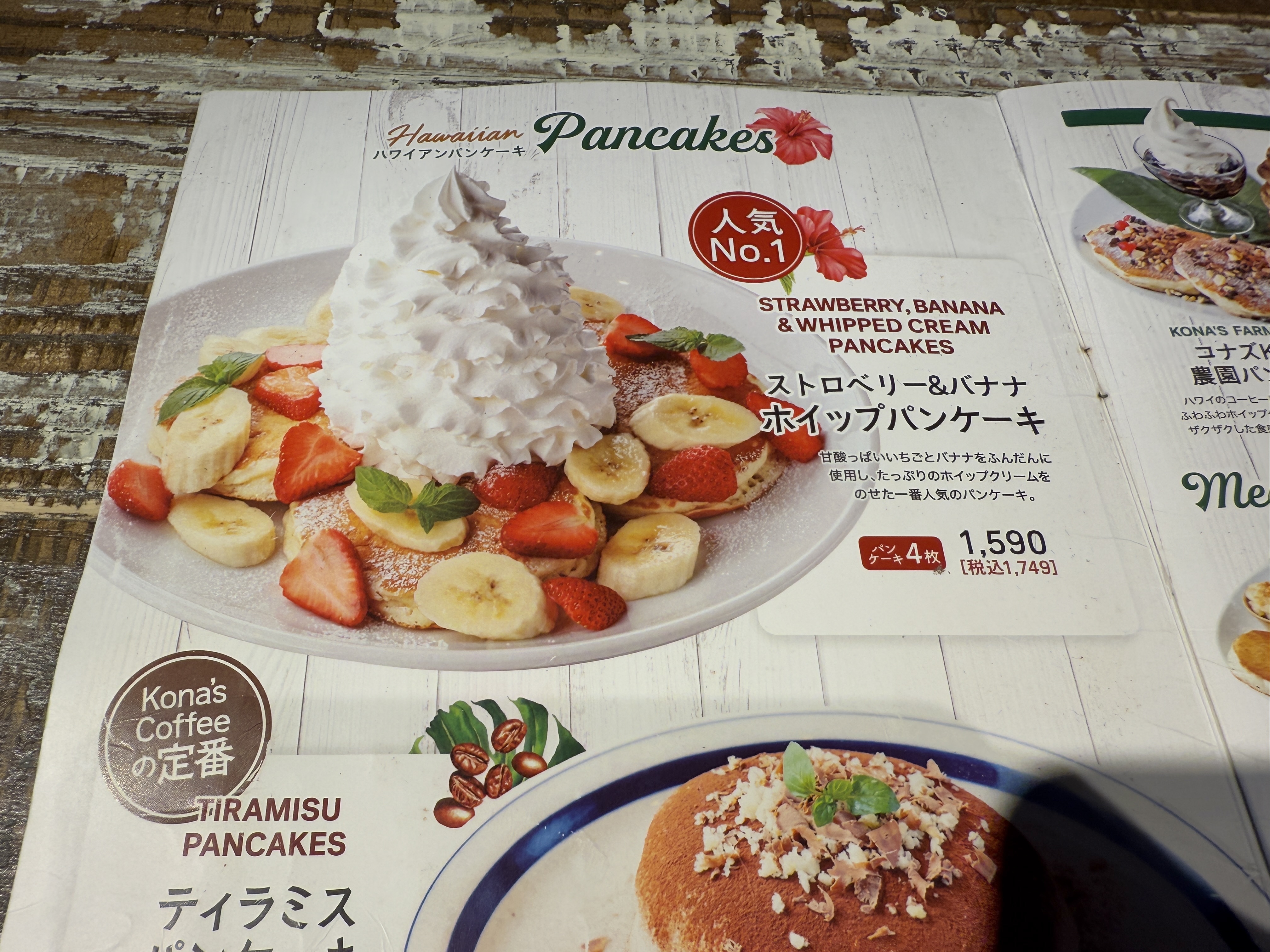 人気No.1メニューの「ストロベリー&バナナ ホイップパンケーキ」は、テーブルに運ばれてきた際に思わず「おぉ!」と声を発してしまうほどホイップクリームの高さがインパクト抜群です。