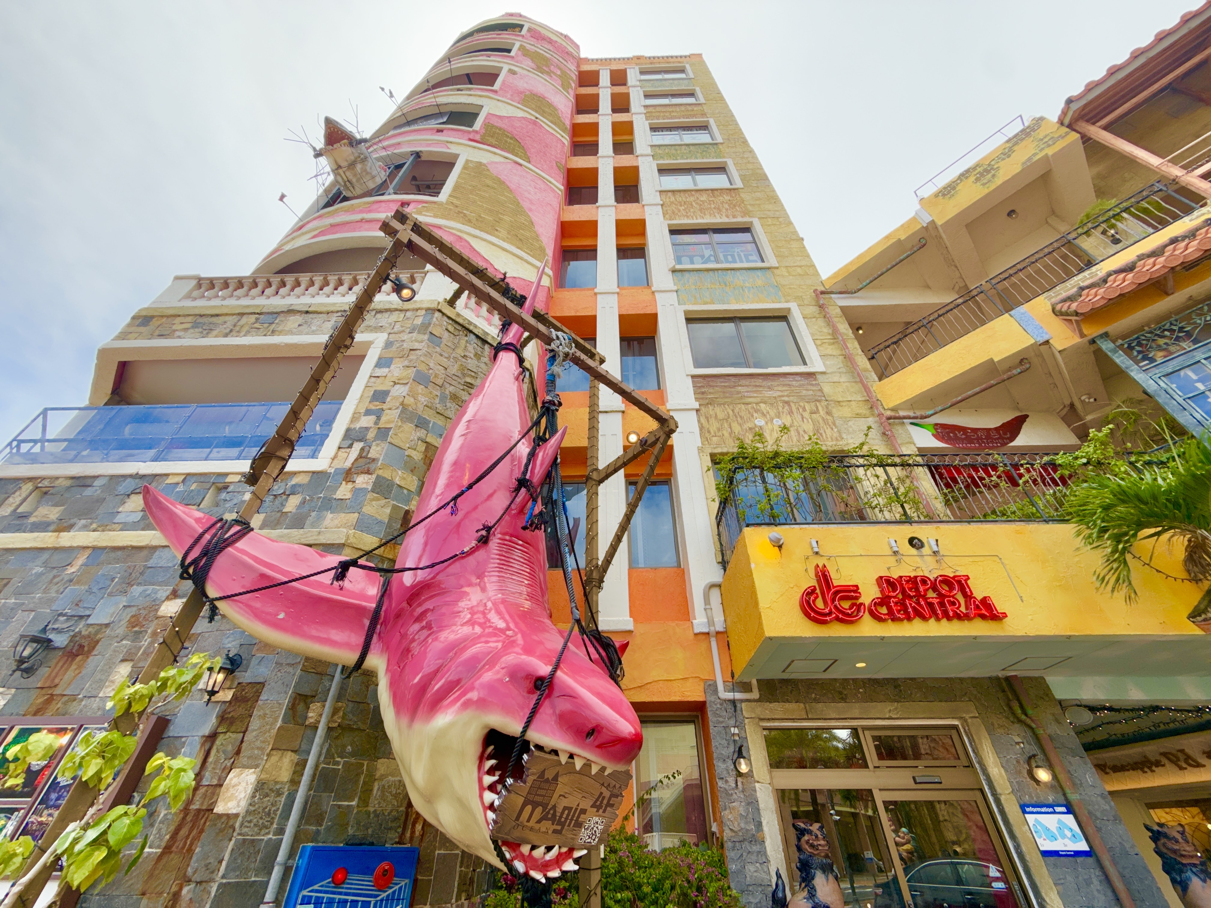 デポセントラルビルの場所は、1階のエレベーター付近に大きなピンク色のサメがいるのが目印の建物です!