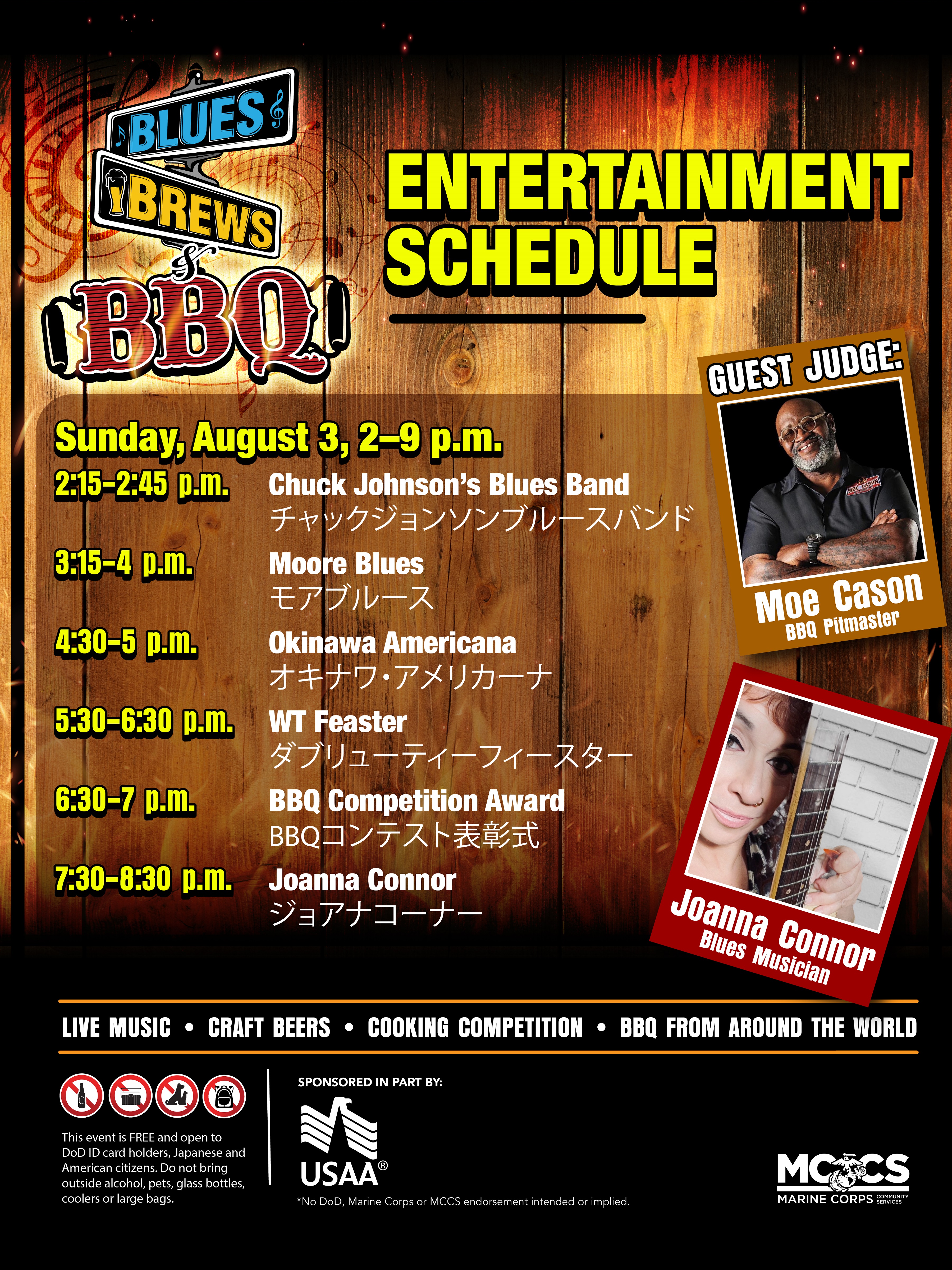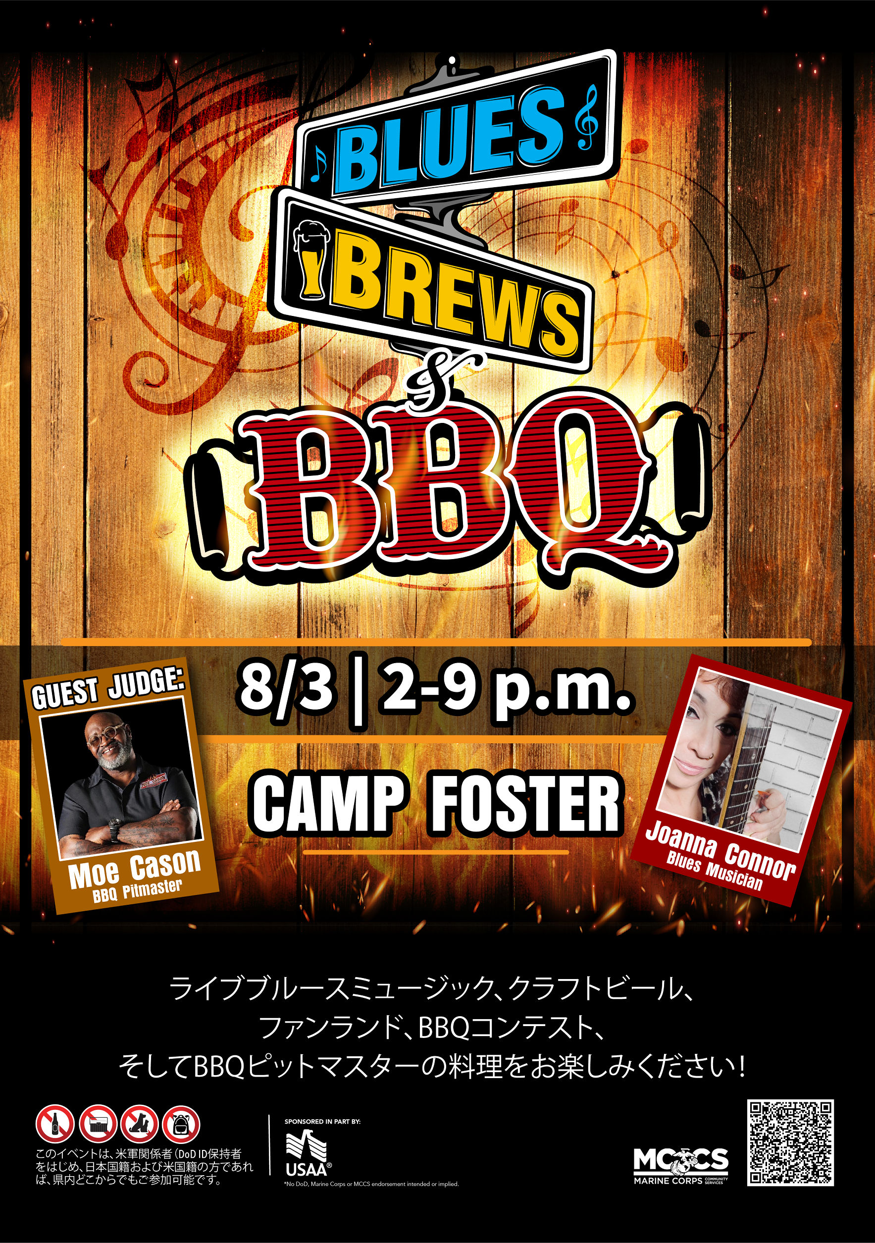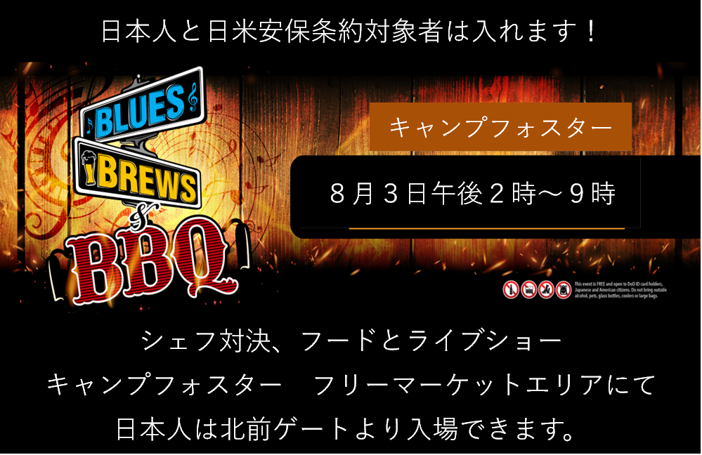 2025年8月3日(日)に、米軍基地内でイベント『Blues, Brews, & BBQ(ブルース・ブリューズ・バーベキュー)』が開催されますよー!