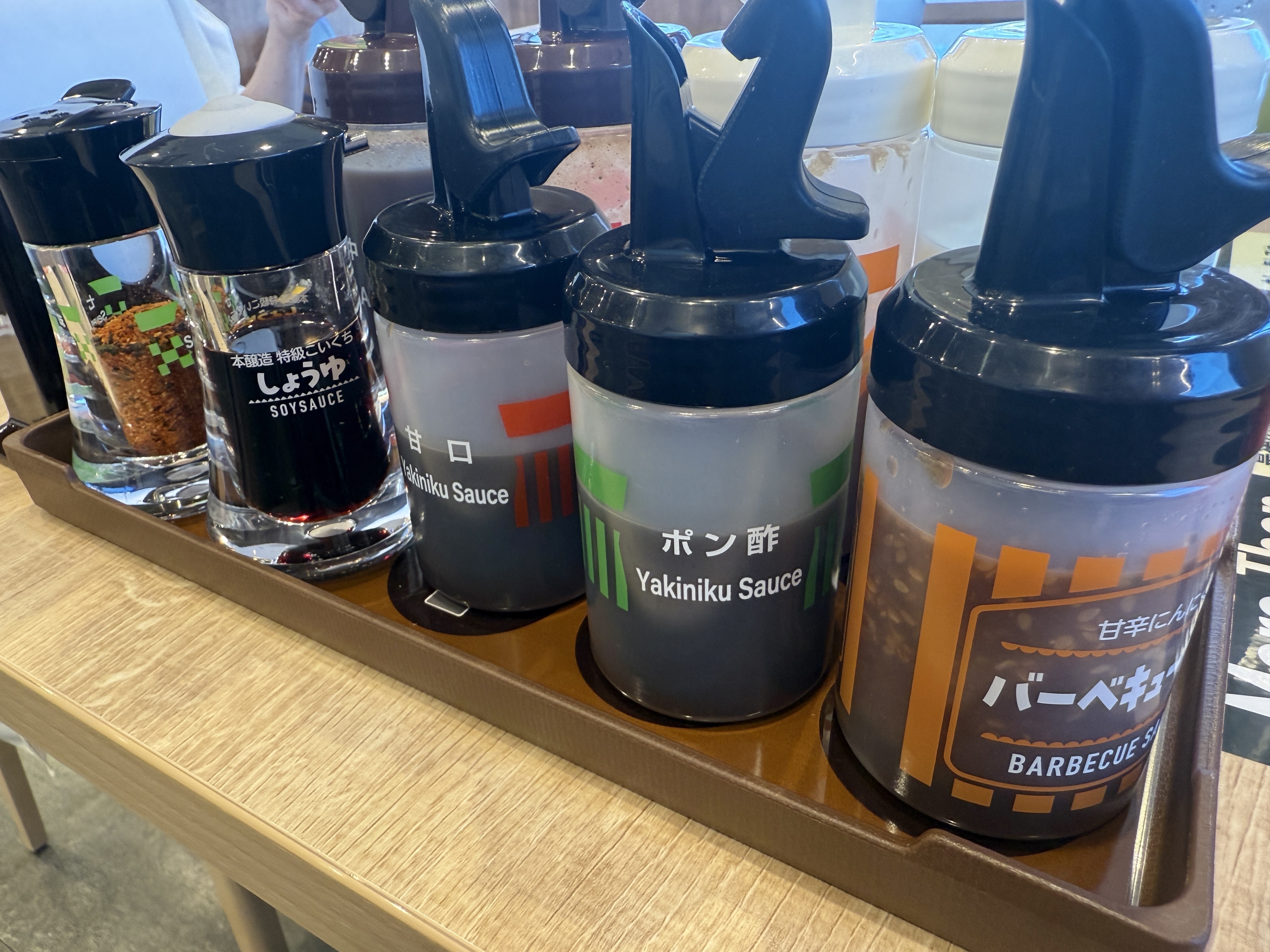 テーブルの上には、ソースやドレッシングが置かれています。