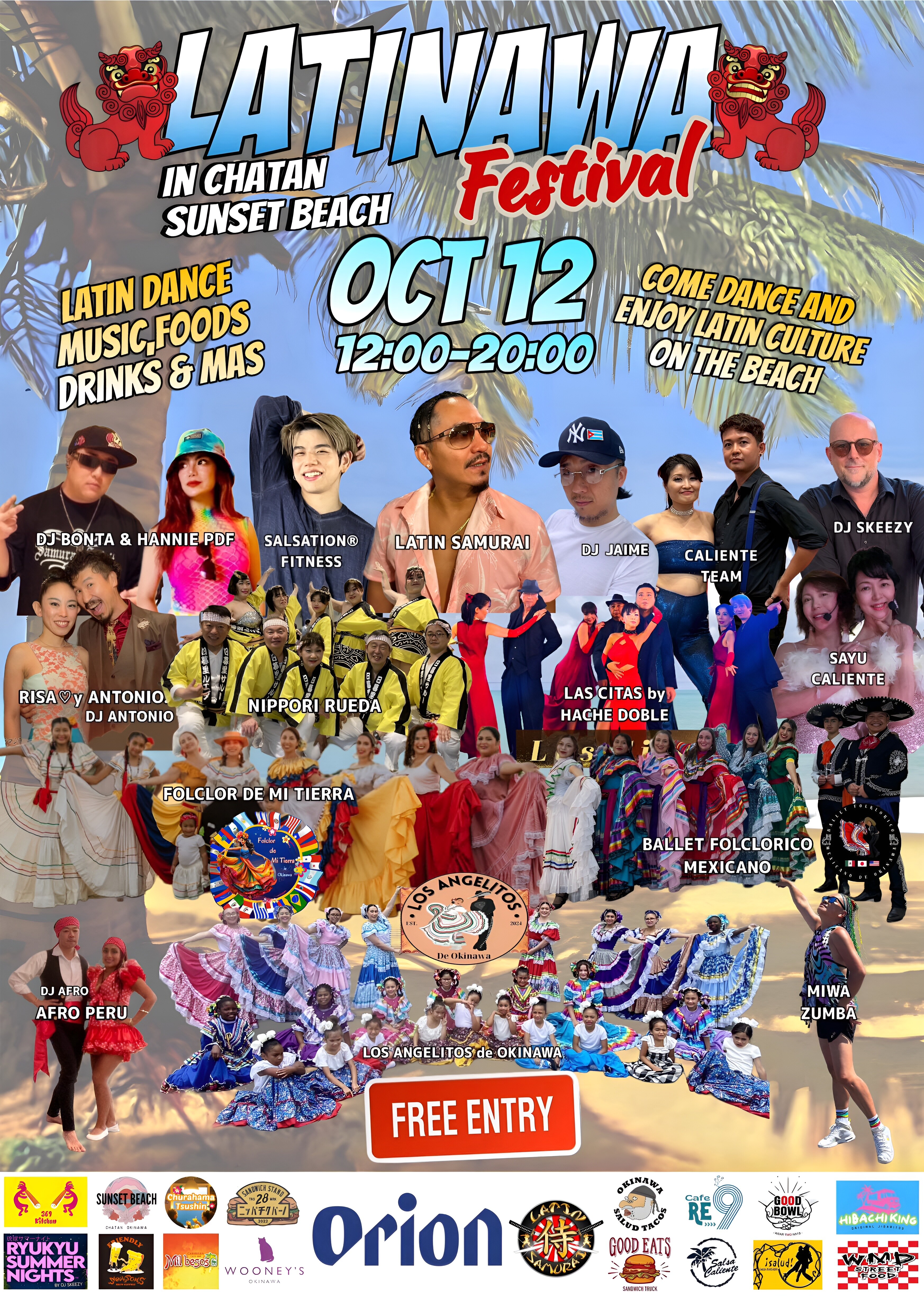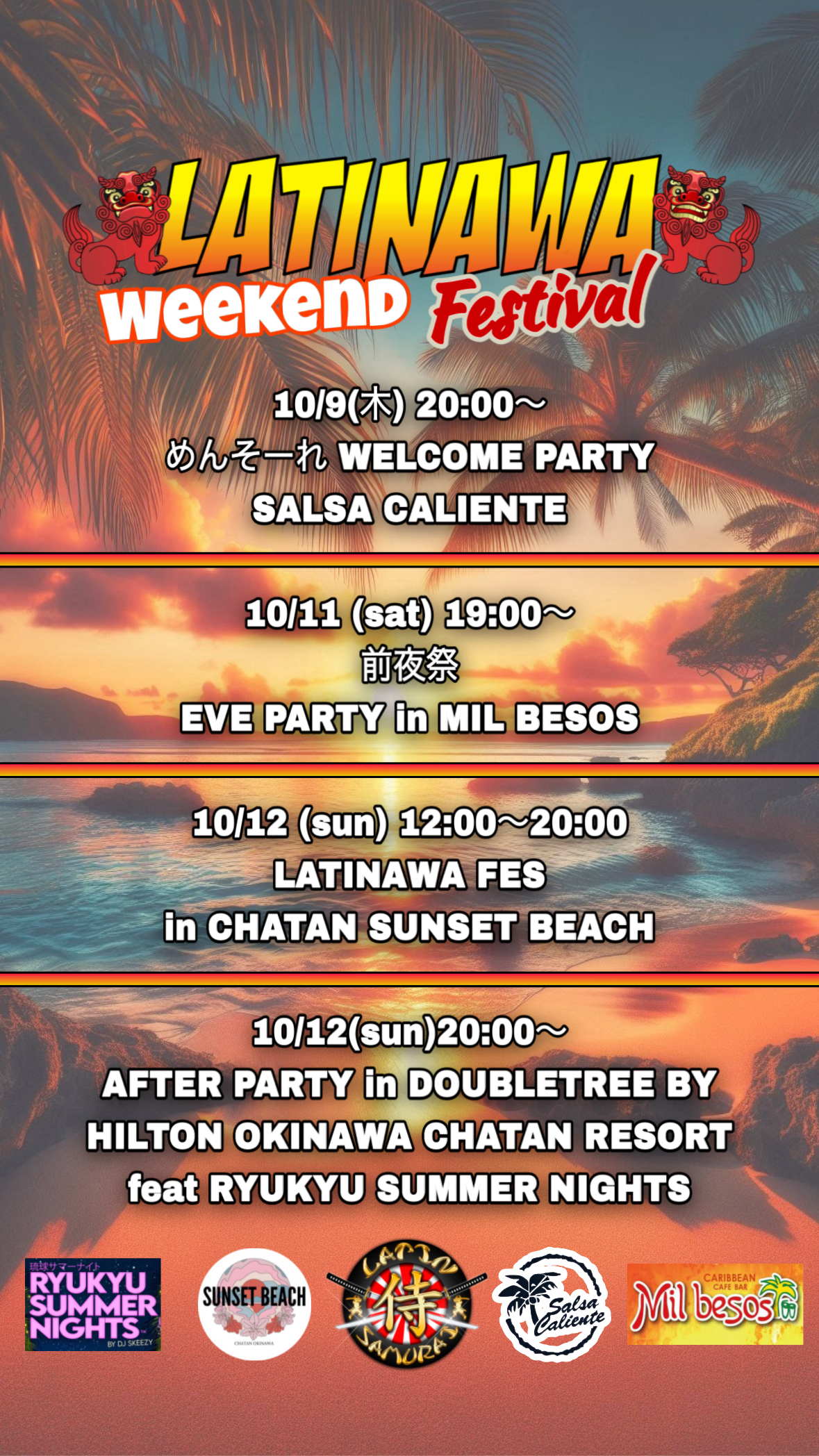 2025年10月12日(日)に、美浜のサンセットビーチでラテンイベント『LATINAWA FESTIVAL』が今年も開催されますよー!