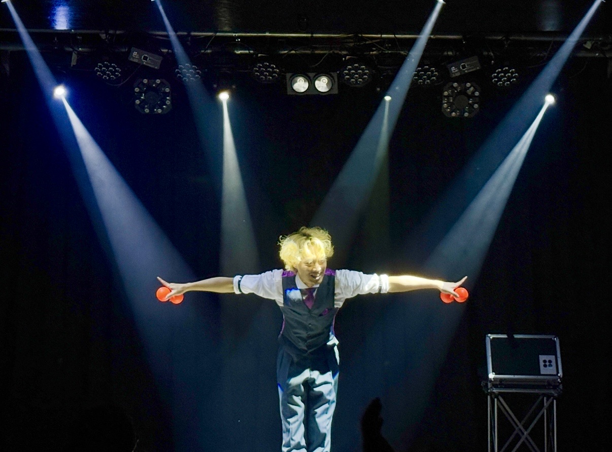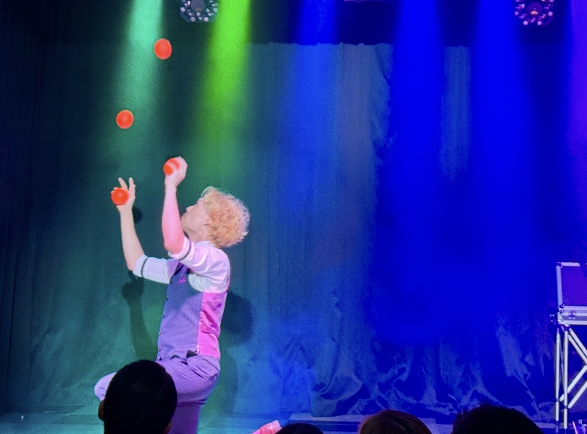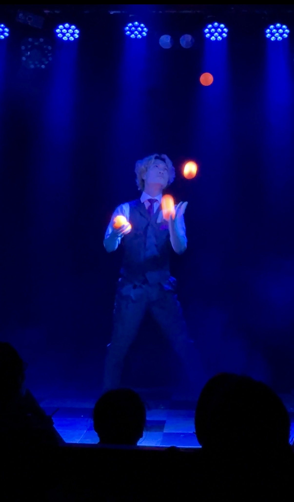 公演後に直接お話しを伺ったところ、10歳からジャグリングをはじめ、25年もの経歴をお持ちとのことです。