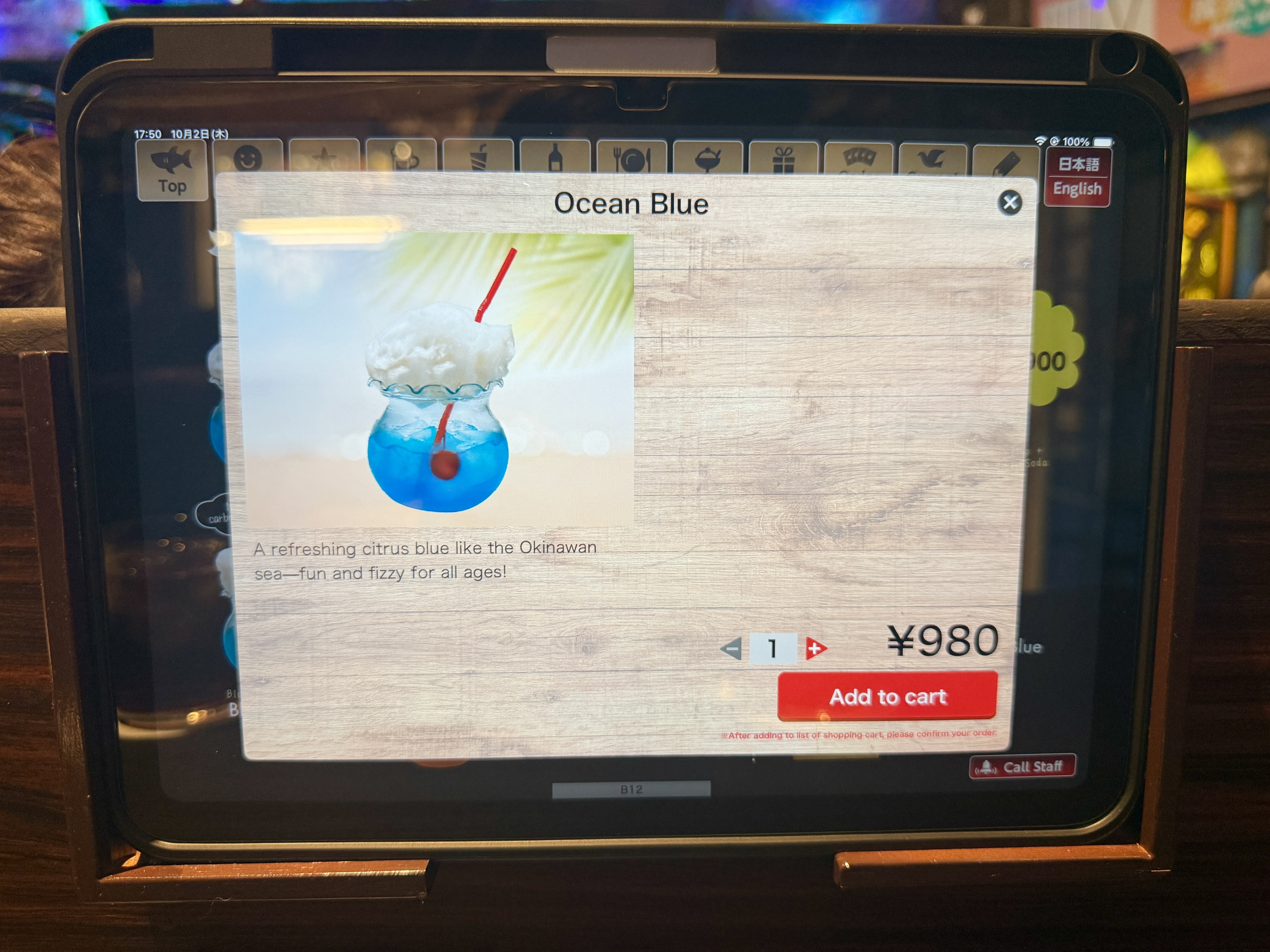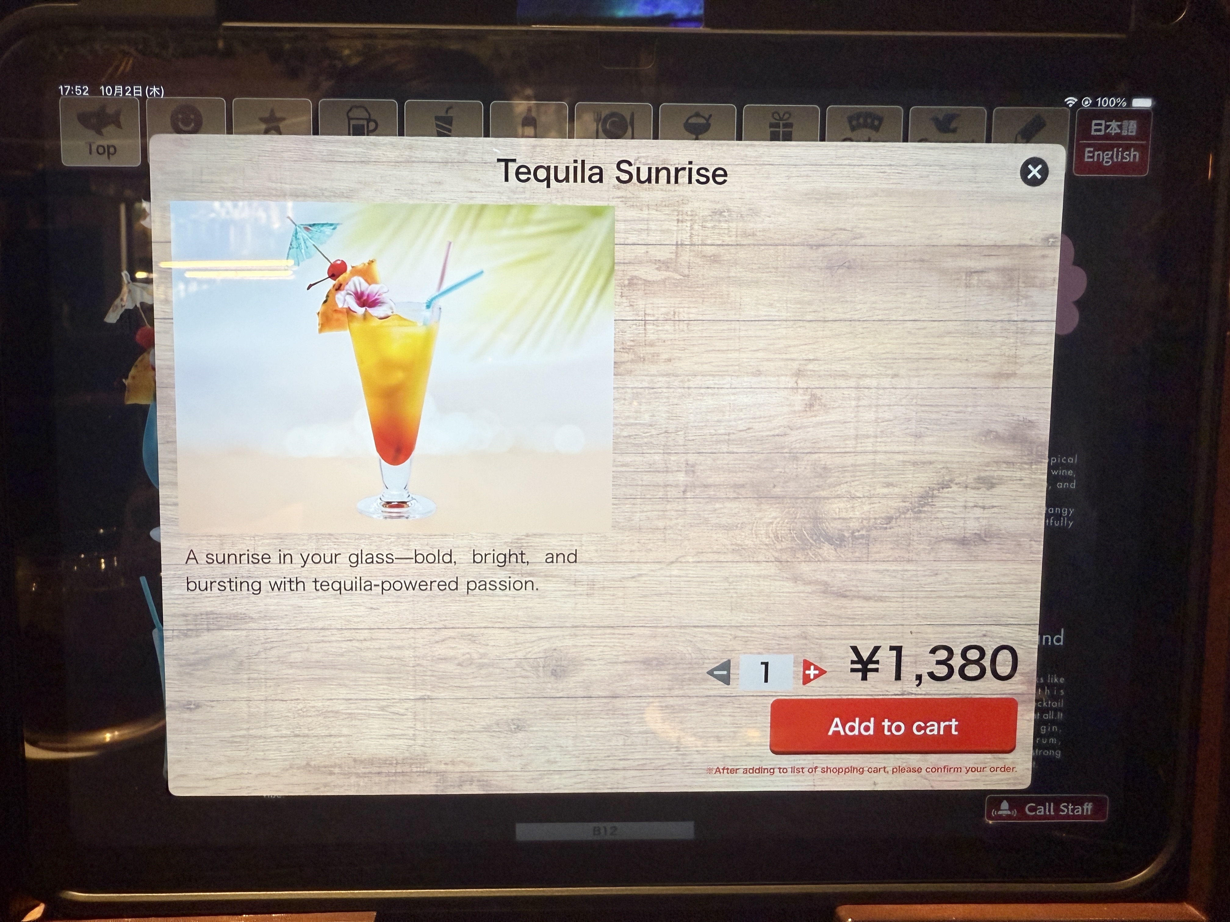 お席に備え付けられている、こちらのタブレットから注文できます。