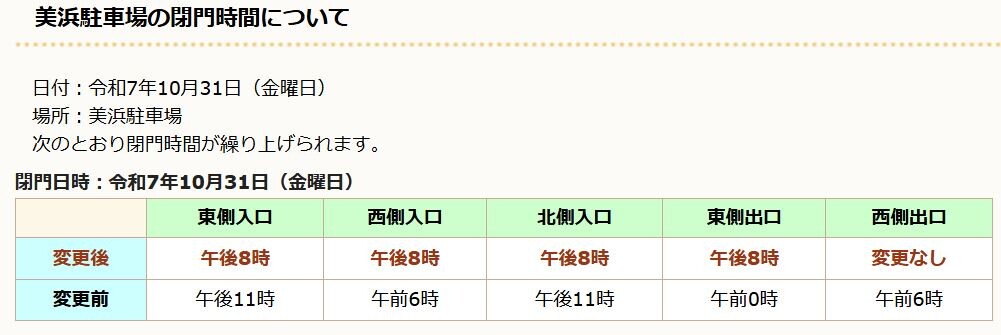 同じ日の2025年10月31日(金)20時より美浜地区内で交通規制がおこなわれます!