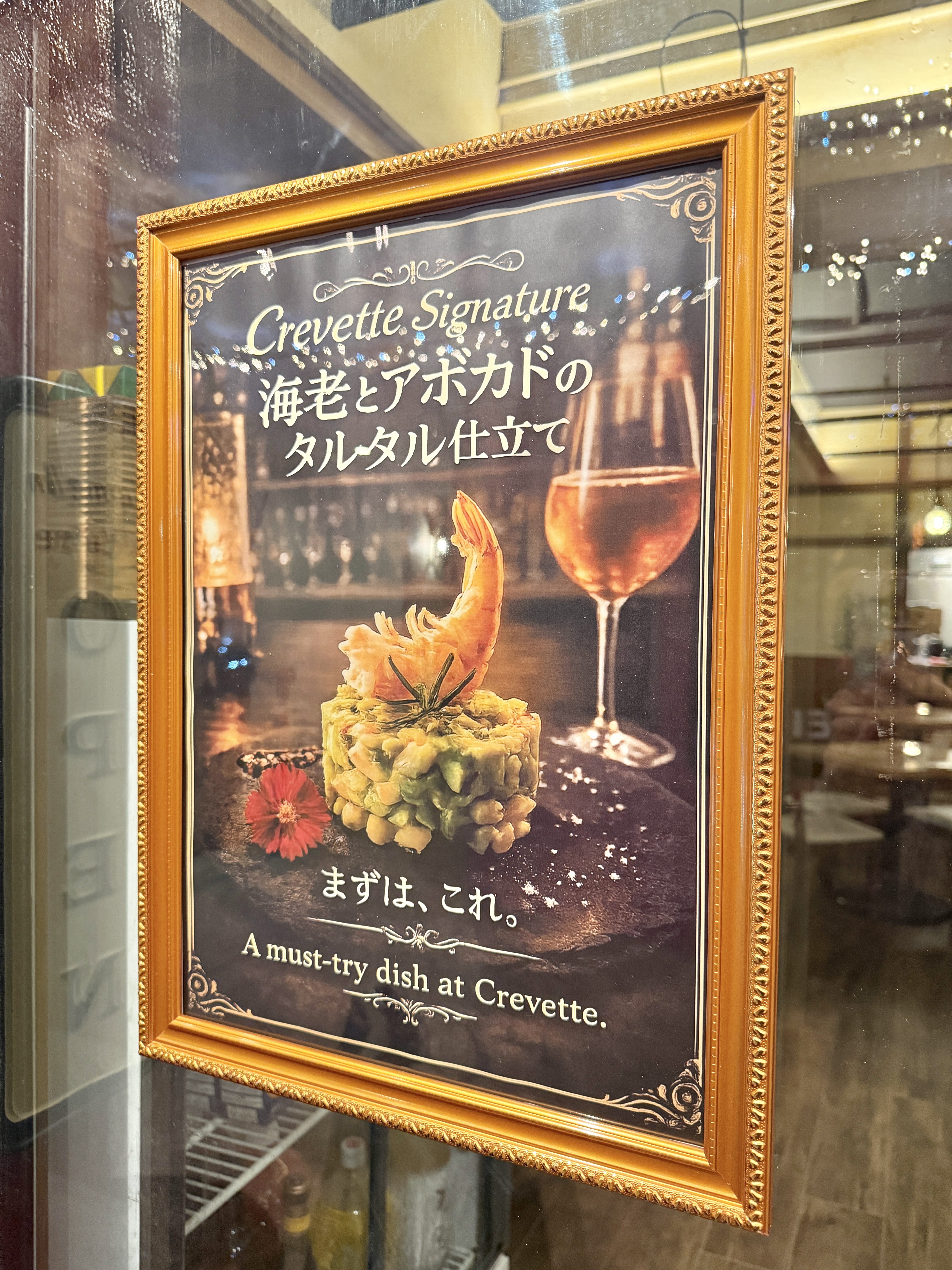 美味しそうなエビ料理の写真が出入り口前の窓ガラスに掲示されています。