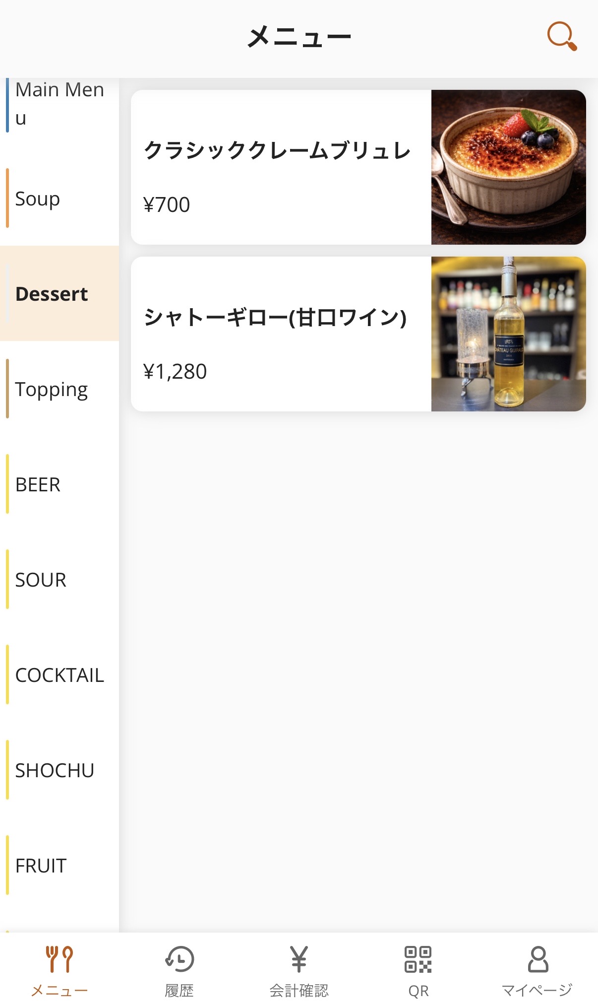 デザートワインとクレームブリュレは、QRコードメニューにあります。