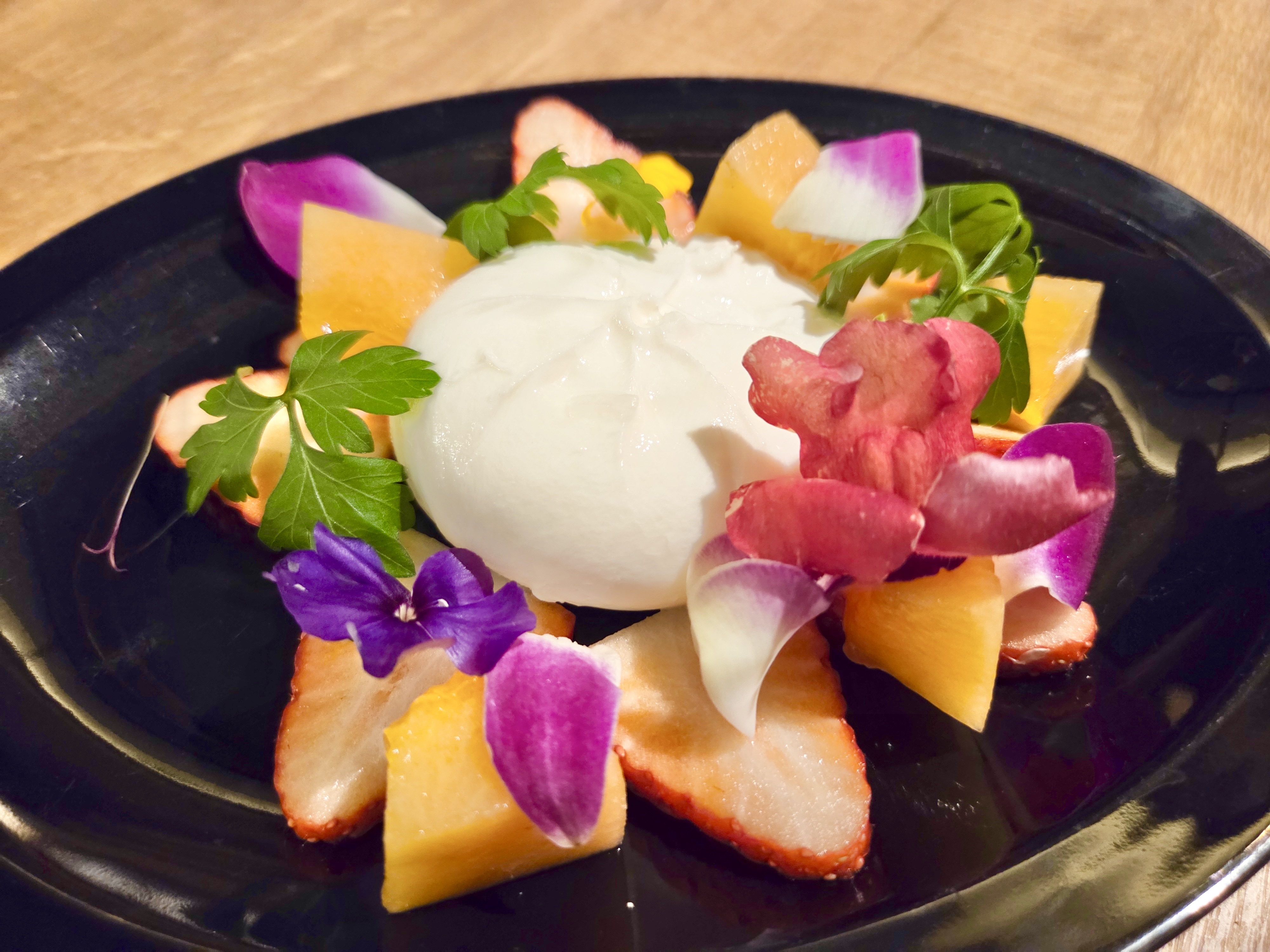 とろりとした食感のフレッシュチーズのブッラータに果実をディップしていただきました。