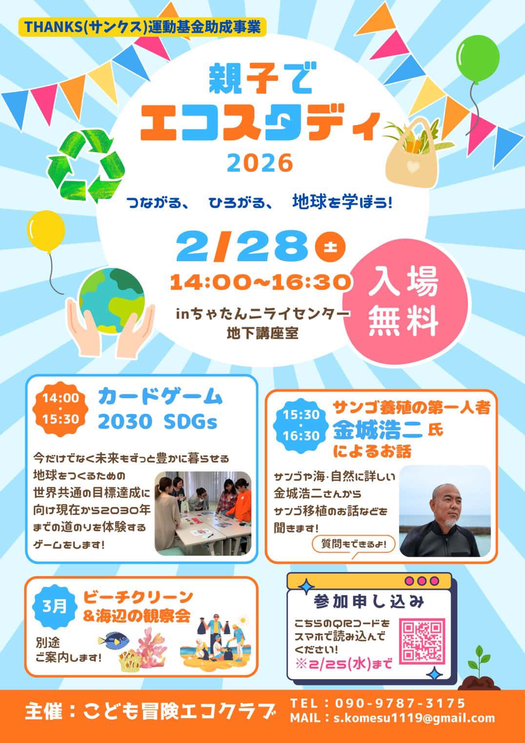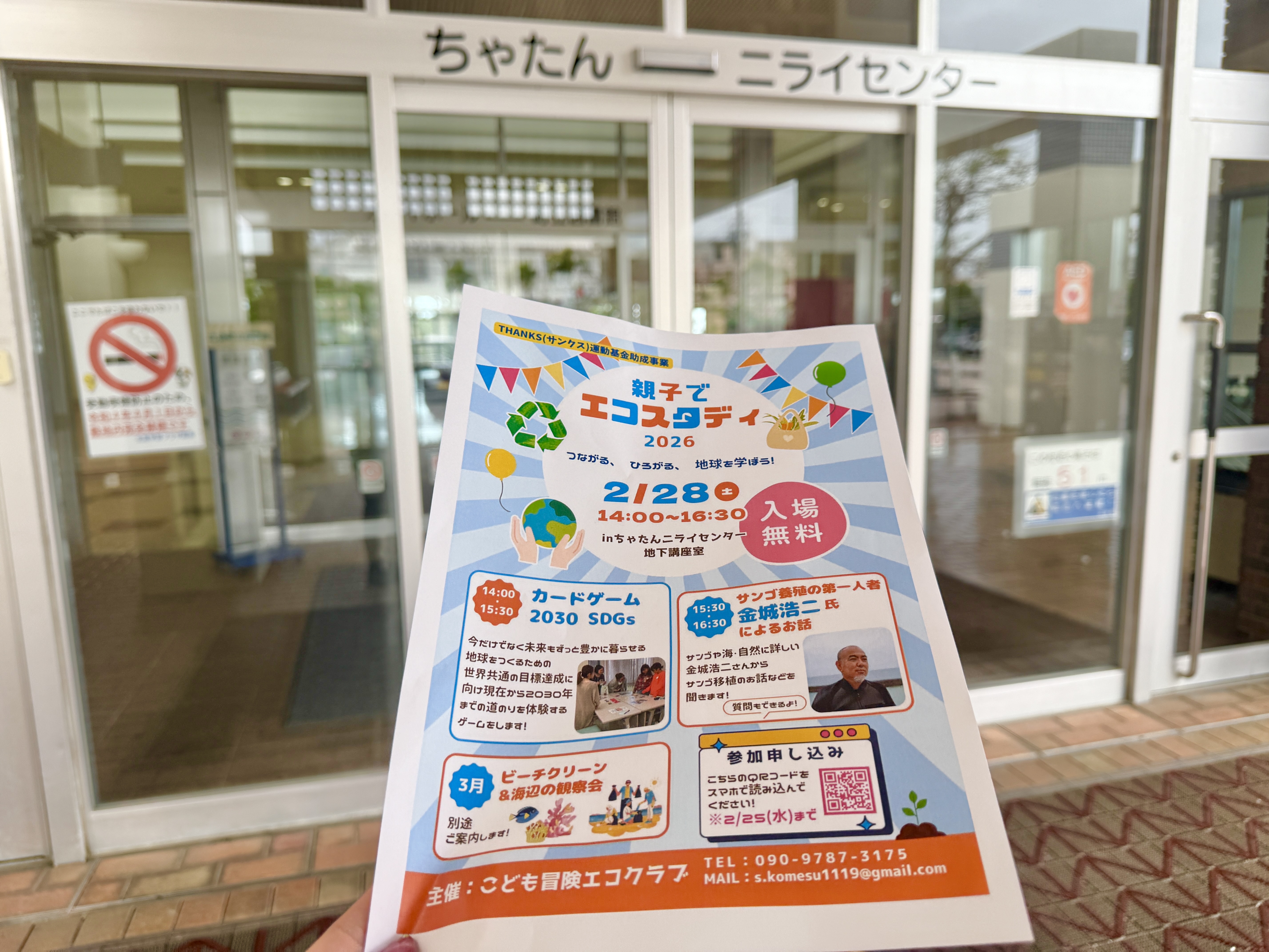 ちゃたんニライセンターの地下講座室にて、『親子でエコスタディ 2026』が、2026年2月28日(土)に開催されますよー!
