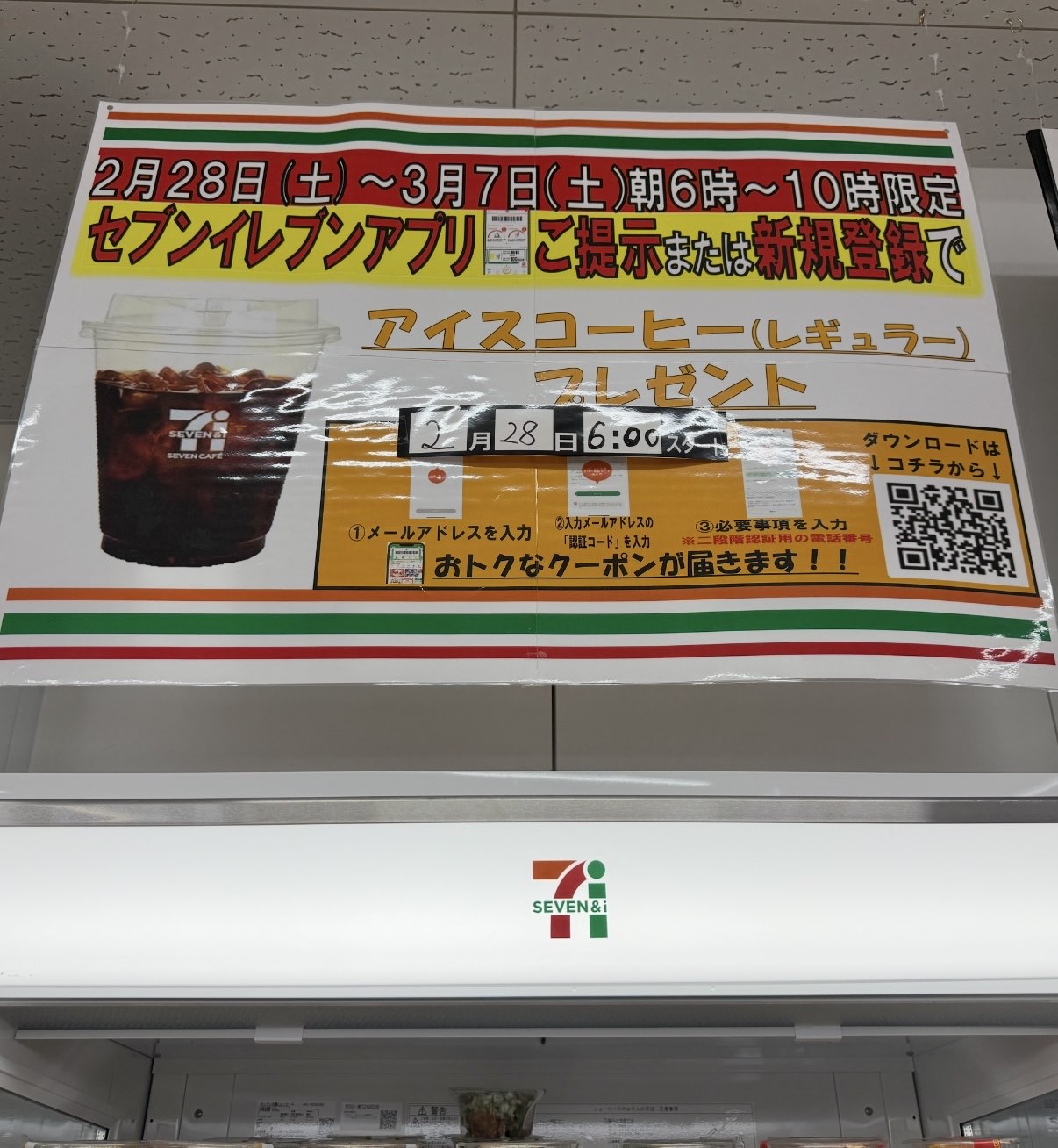 セブンイレブンアプリご提示または新規登録すると、アイスコーヒー(レギュラー)のプレゼントが期間限定であります☆