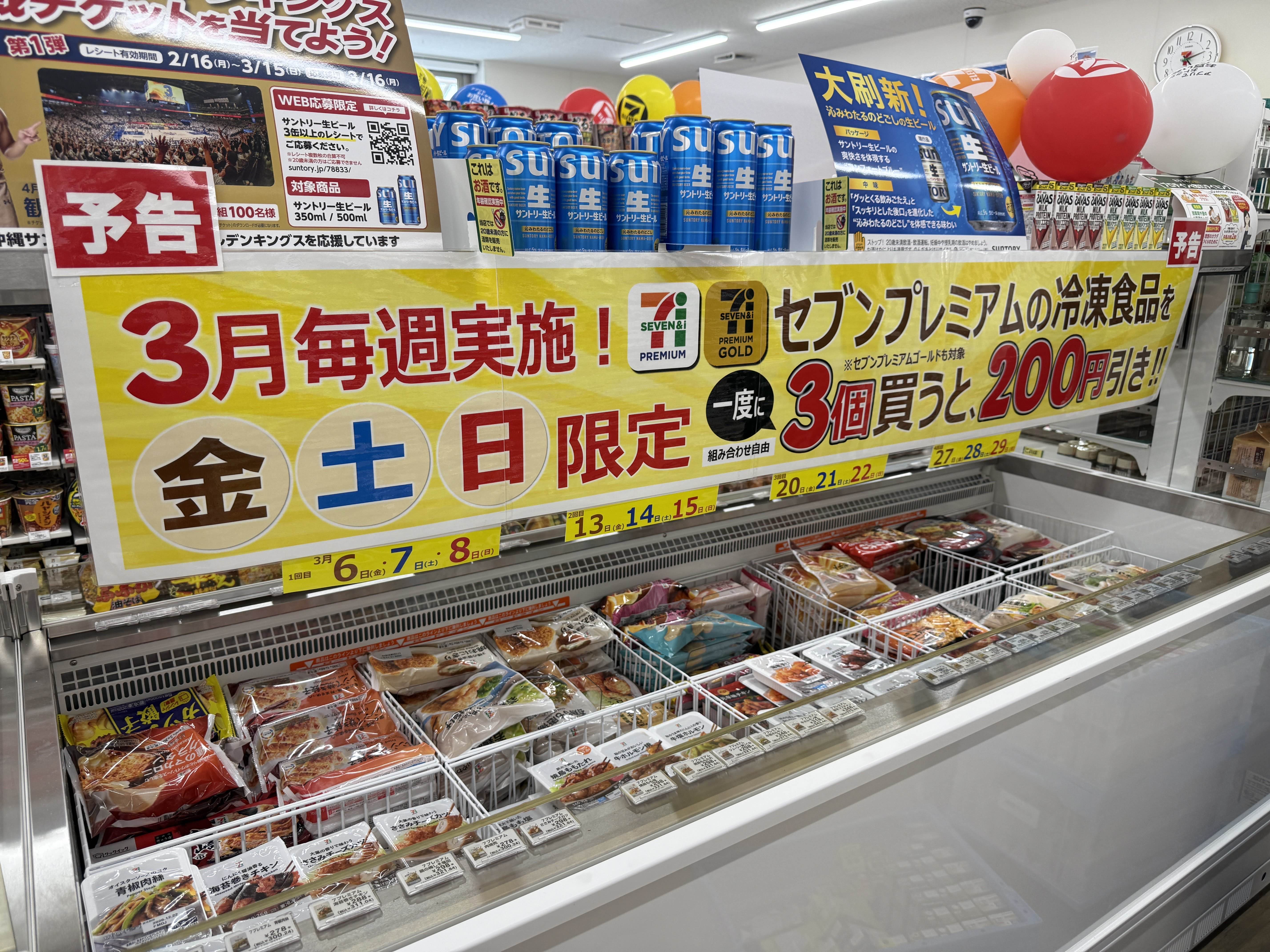 3月の毎週金土日限定で、セブンプレミアムの冷凍食品を一度に3個買うと200円引きです。