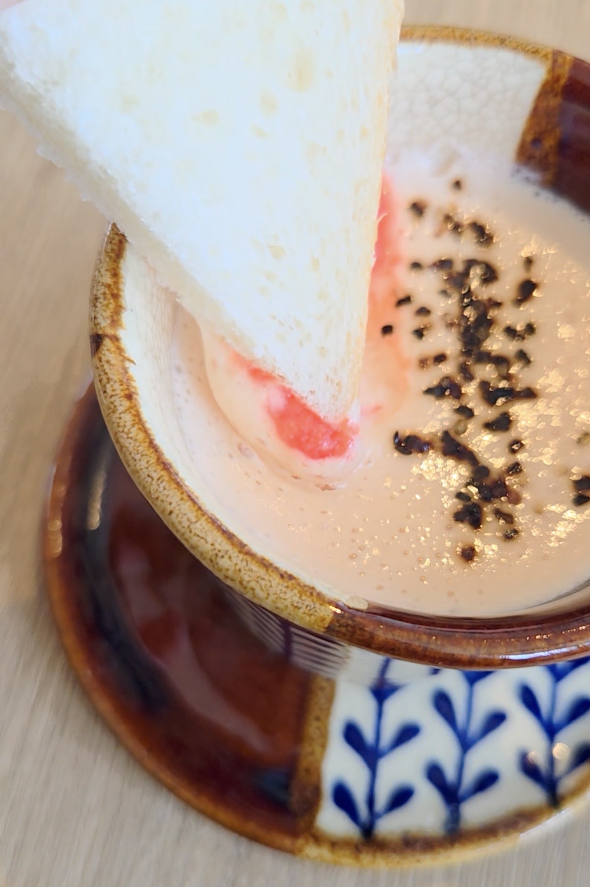 博多明太子ラテは、バケットつきで、まさに「食べるドリンク」を実感しました。