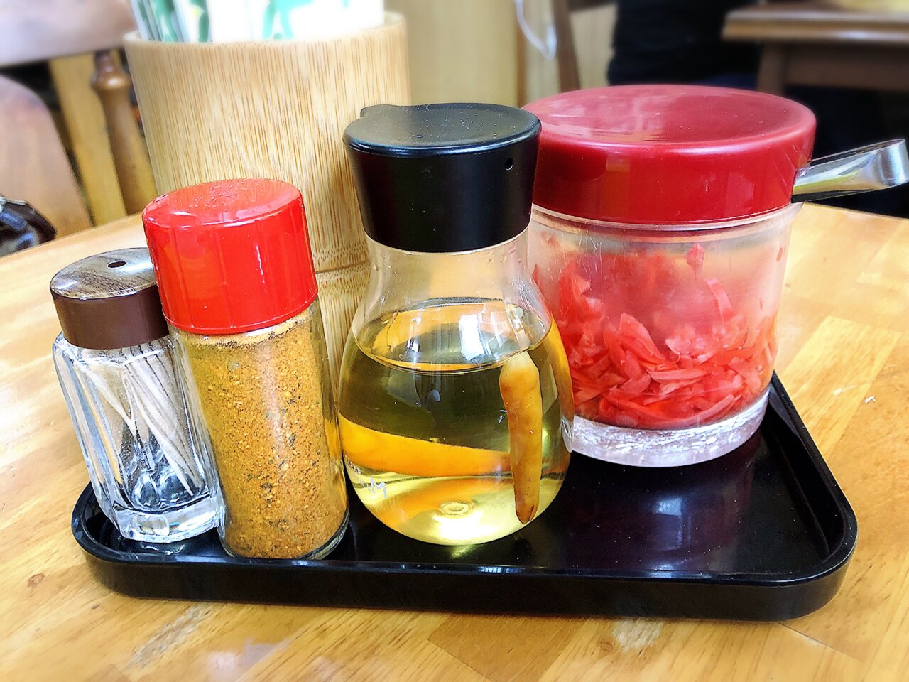 七味唐辛子、コーレーグスー(島とうがらしを泡盛に漬けたもの)、紅生姜
