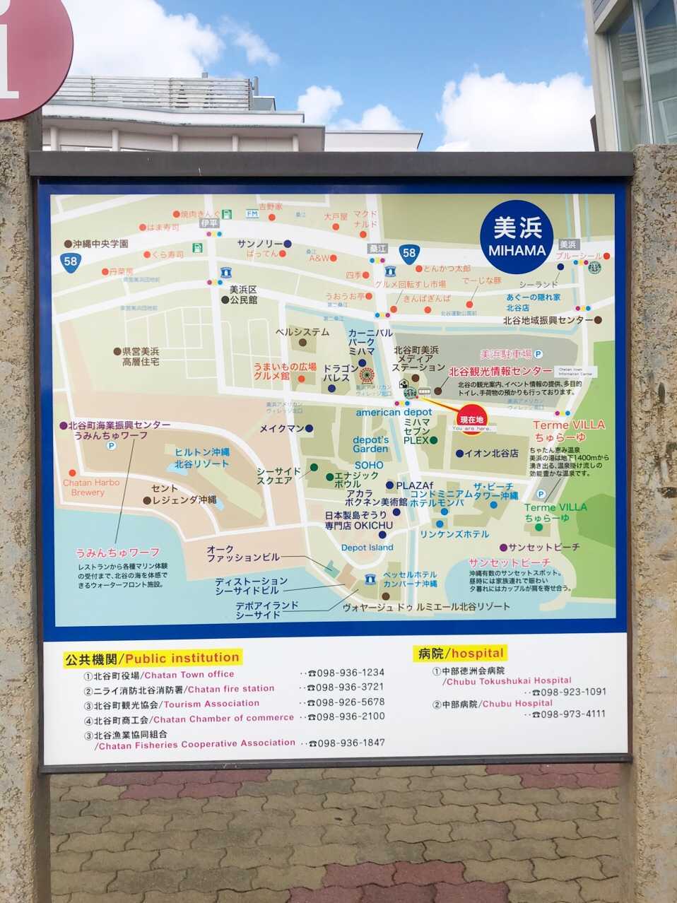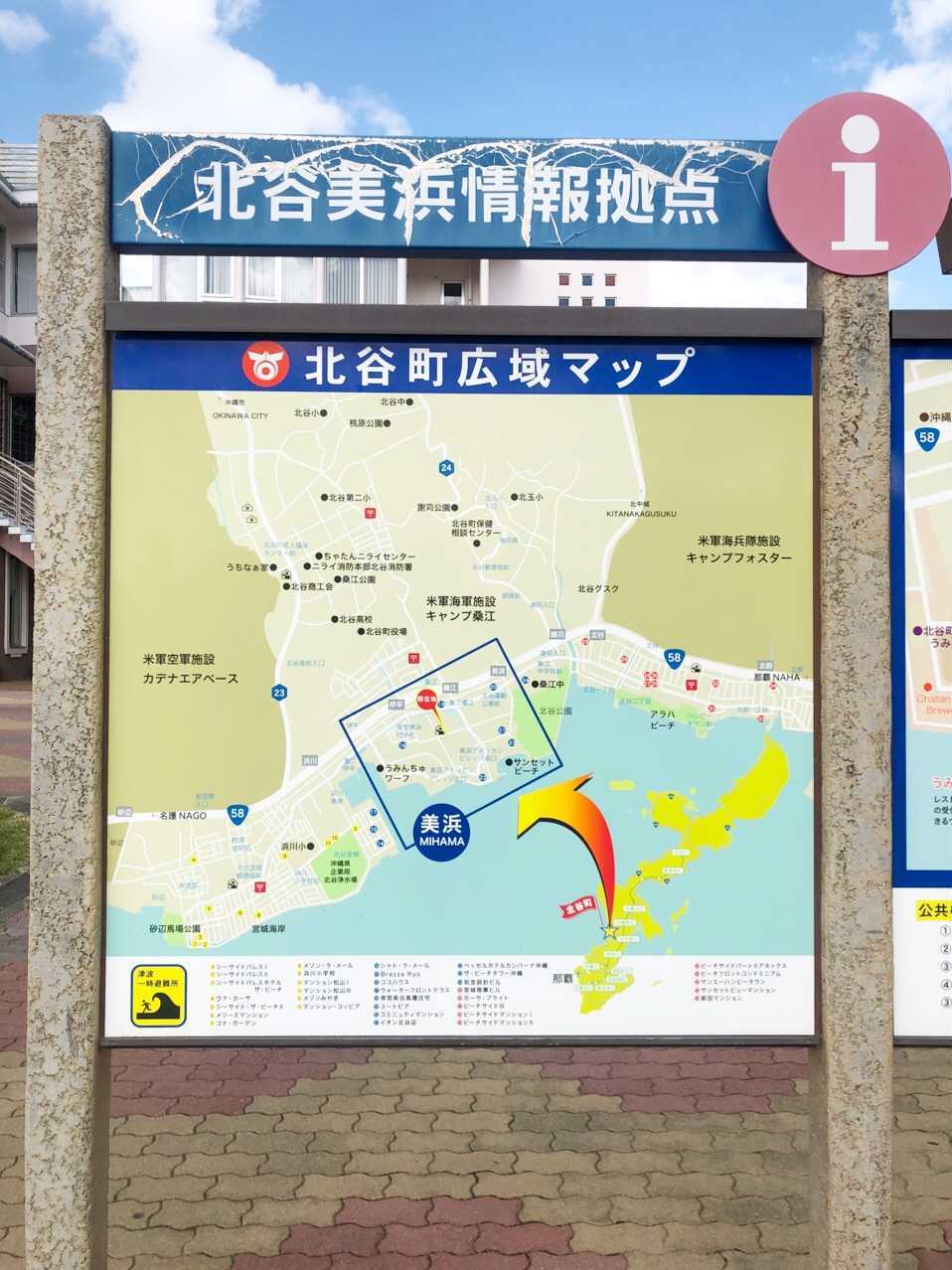 北谷町全体が分かる広域マップと美浜エリアにフォーカスしたマップの2種類が立っています。