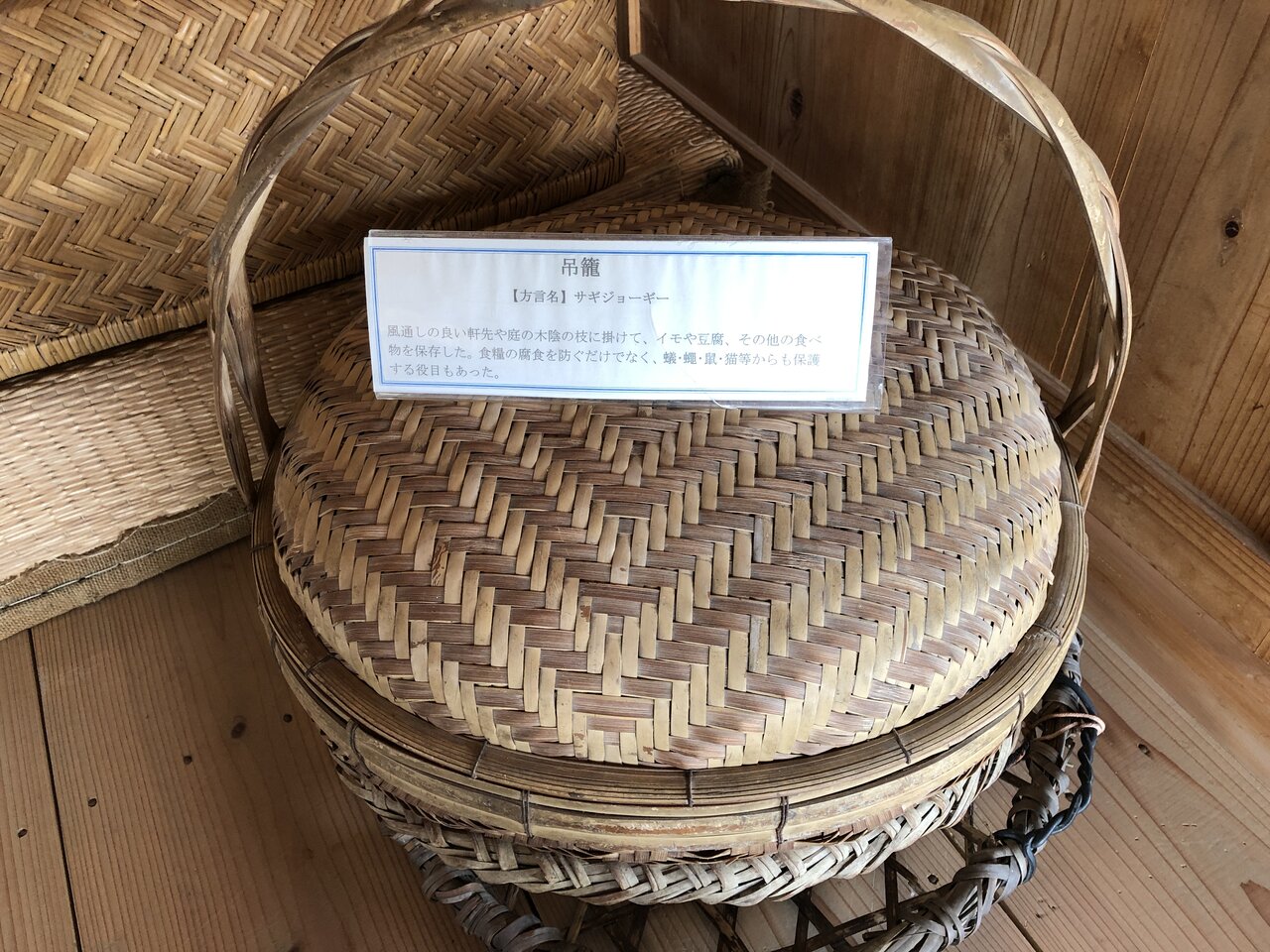 これは吊籠と呼ばれ、風通しの良い軒先や庭の木陰に掛けて、イモや豆腐、その他の食料を保存するための物。食料の腐食だけではなく、蟻・蝉・鼠・猫から保護する役目も。