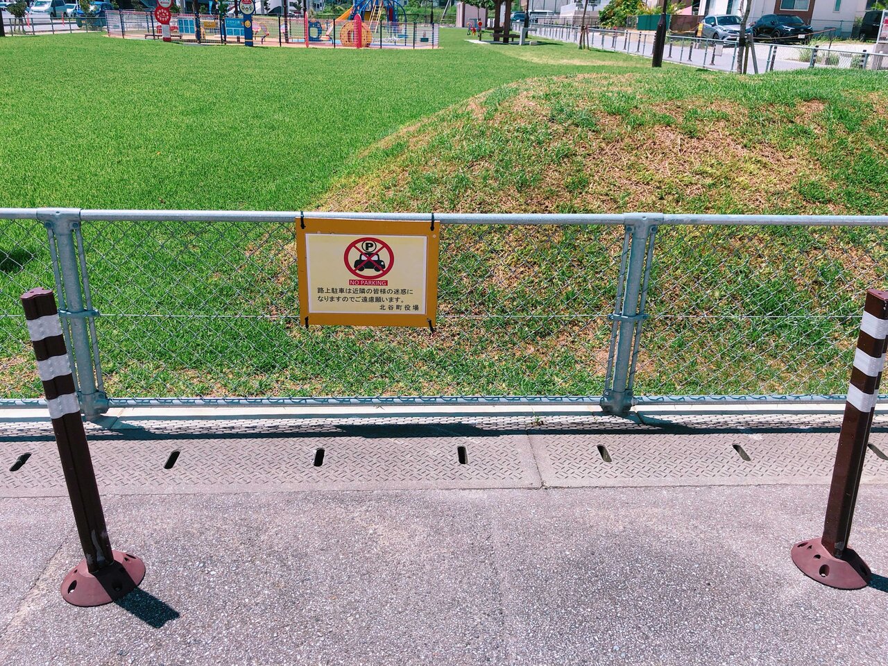 路上に停めないよう公園の周囲には注意喚起の掲示とポールが立っています。