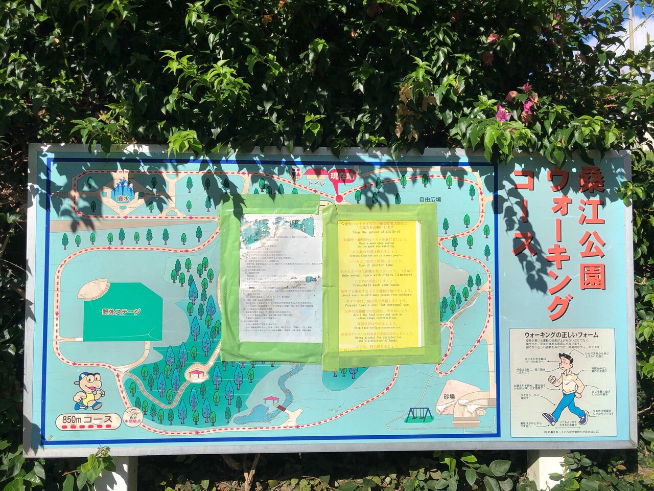 ウォーキングコースの案内板には感染症の注意喚起等が掲示されていました。