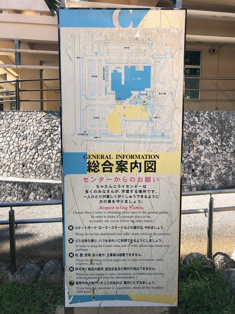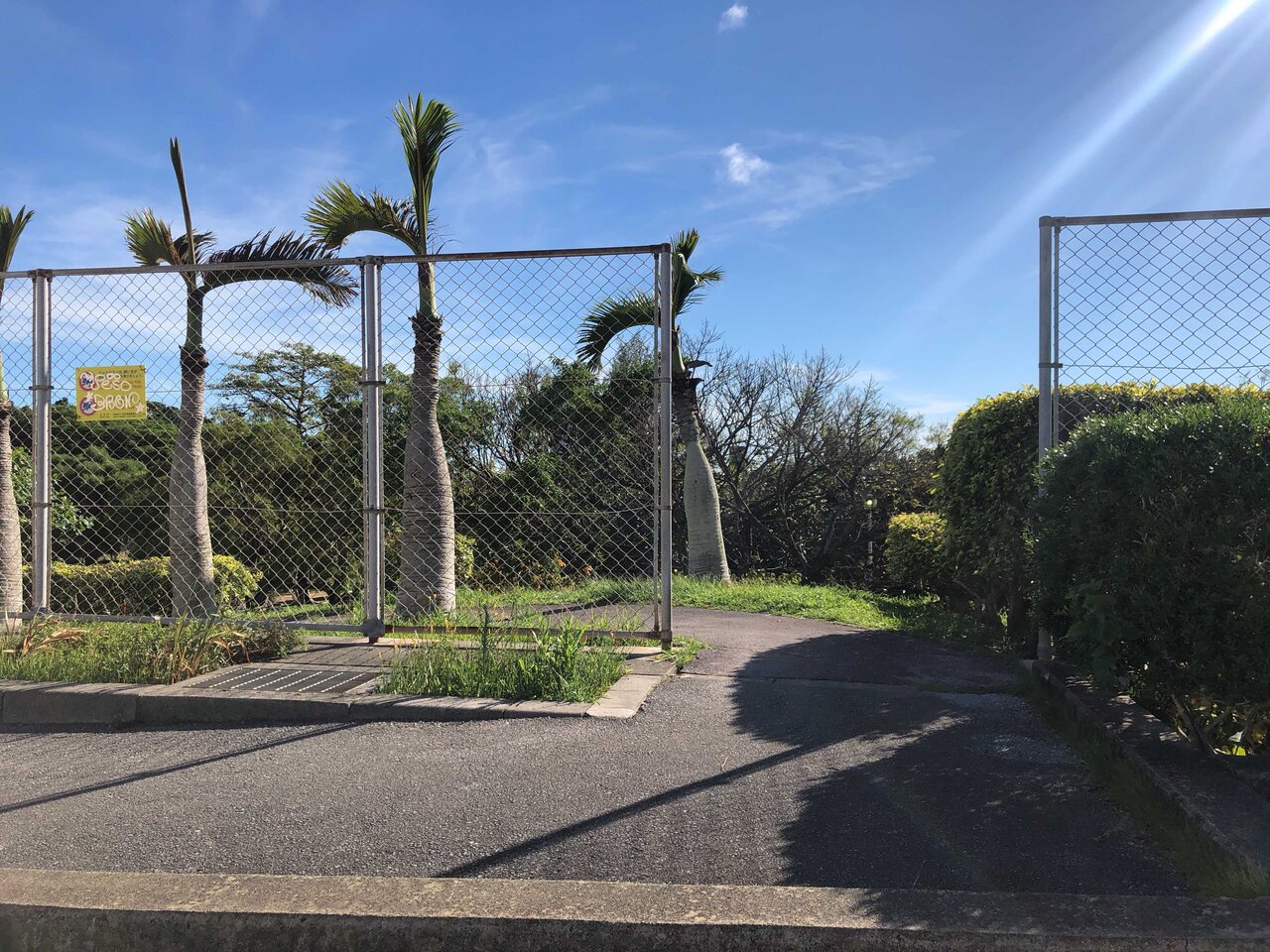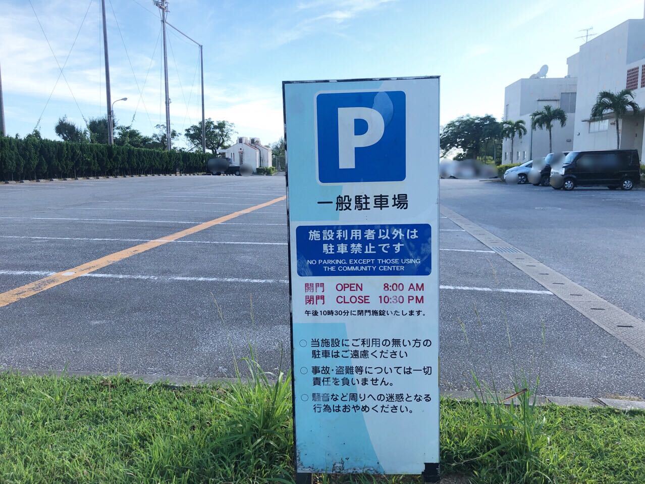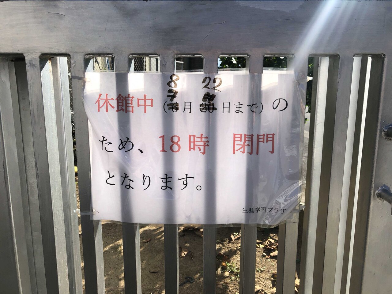 駐車場の門にはニライセンター内の「生涯学習プラザ」さんからの案内で[18時閉門]という張り紙が掲示されています。